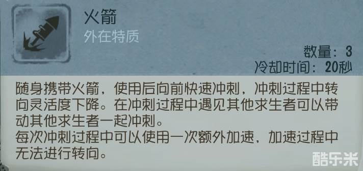 ⑤每次使用火箭冲刺有一次额外加速机会,利用此技能在面对监管(如邦邦的炸弹,”使徒“的扑袭)时可以灵活使用加速,逃脱出技能范围的同时与监管者拉开身位,令监管者的追击和拦截功亏一篑。但需注意加速技能使用期间无法转向,把握好冲刺技能释放位置与朝向是达成完美牵制的诀窍!