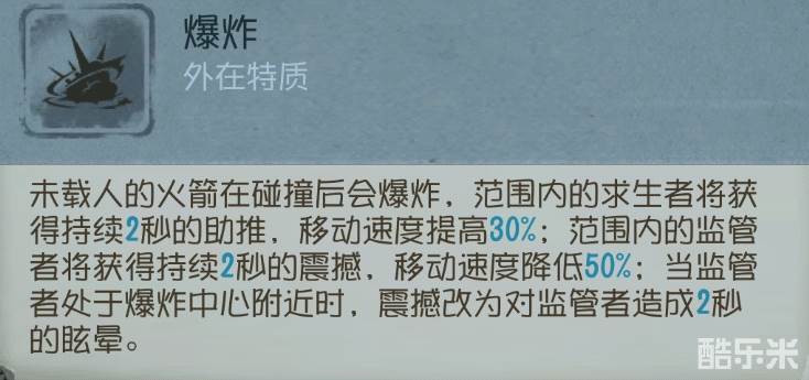 开局被追击可以直接利用技能拉开距离,火箭冲刺配合爆炸的移速加成以及双弹射,在前期是监管者很难针对的角色,即使出现失误,被救援下椅后利用火箭冲刺远离监管者,拉出较大身距,仍然能给自己的二次牵制创造大量机会。如配合祭司超长通道,利用火箭进洞能打出无限可能。如在对局中遇到队友牵制到附近,可以释放火箭利用爆炸帮助队友进行牵制。