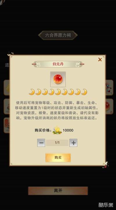 宠物归元丹在赤霄天六合界的愿力词里面,需要一万愿力值才能购买。
