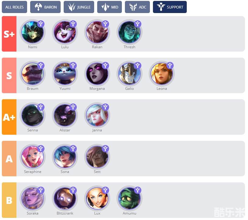 辅助位在新版本是没有英雄改动的,推荐大家把T1级别的硬、软辅助都练下,以便应对不同的对局。
