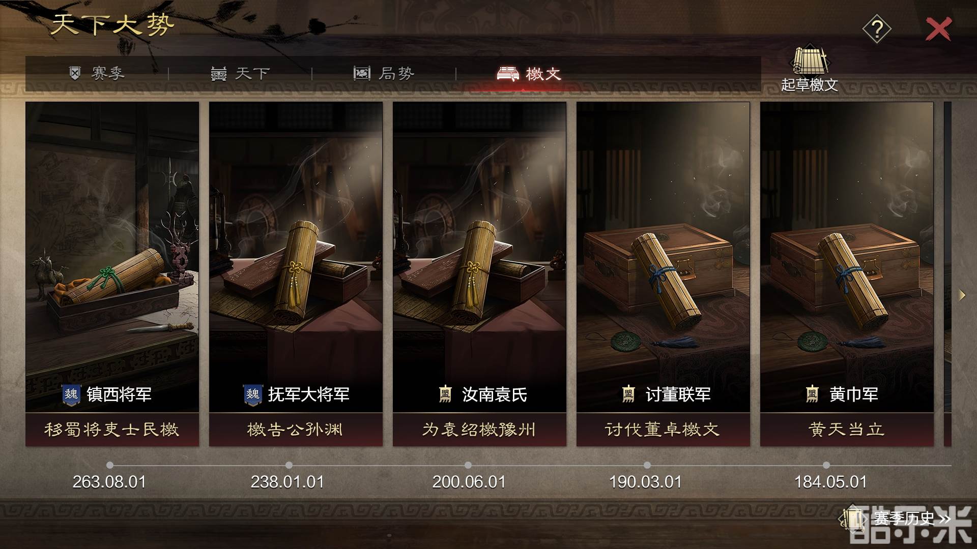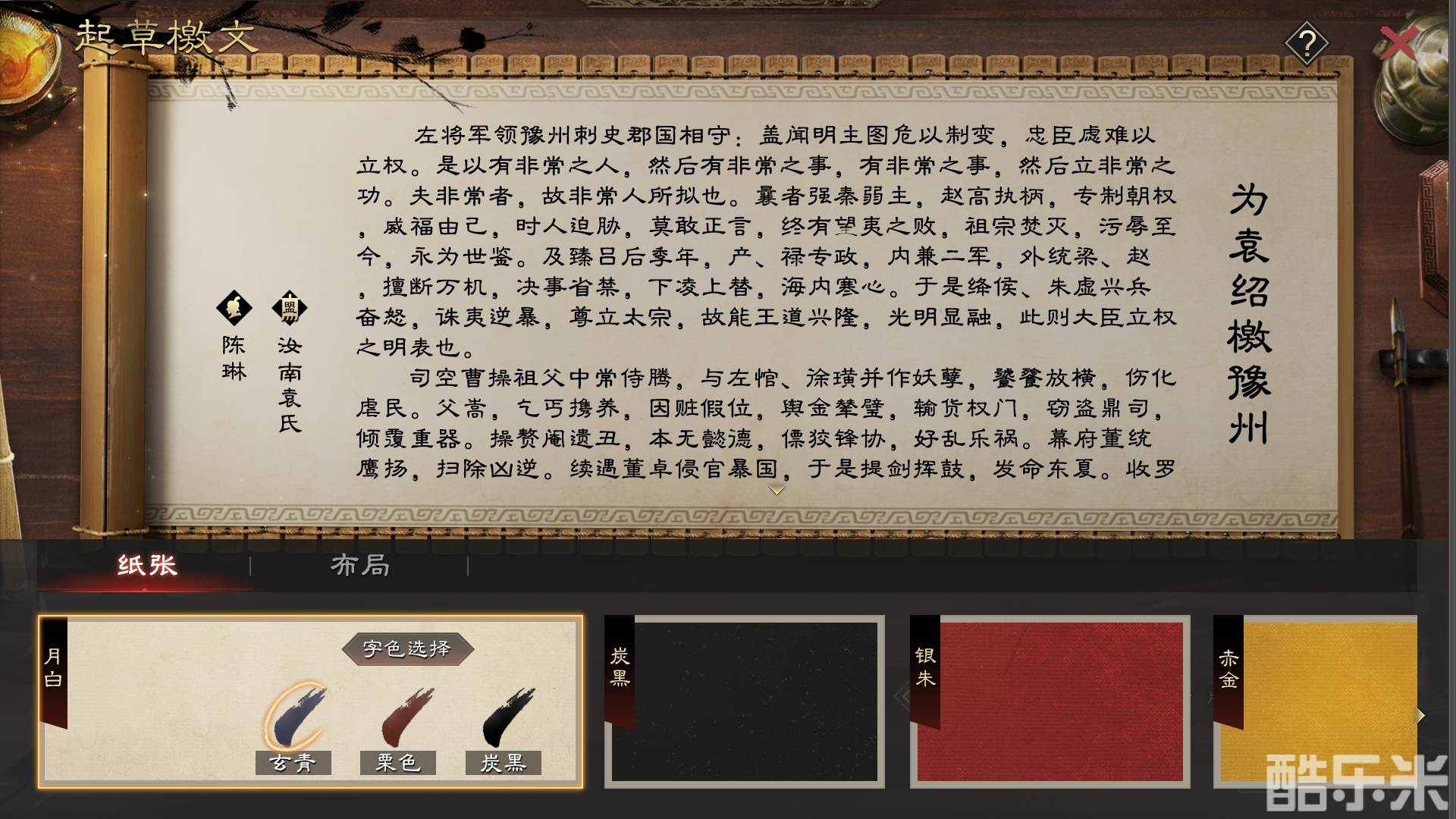 檄文作为正式的对外文书,配有对应规格的竹帛丹青,各位主公可根据表达内容选用不同样式的纸张、墨色和行文布局。