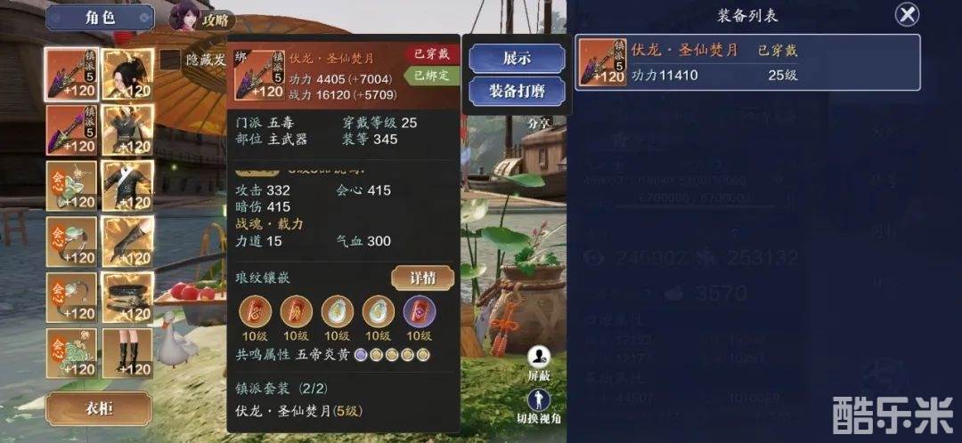 1)主武器提升183点功力,属性:会心/暗伤415、攻击332