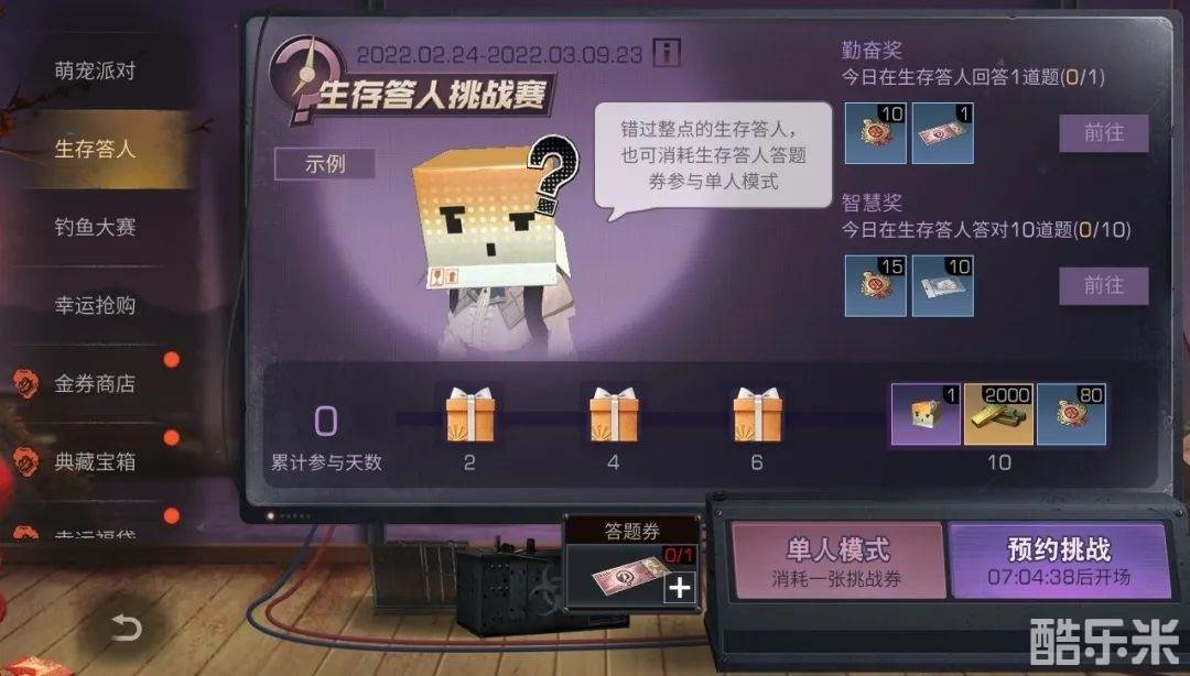 2、错过整点的幸存者可以用生存答人答题卷,立刻参与生存答人单人挑战,也能获得相应奖励。