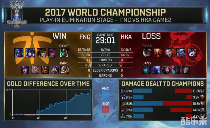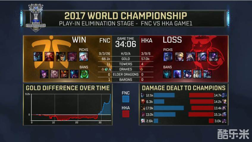 FNC拿到了一套极强的三保二阵容,HKA则是后期非常强力的阵容。比赛开始,双方打野均是下半部野区开,比赛前期,HKA中下同时取得对线优势,被逼无奈FNC选择换线避其锋芒,但推塔节奏仍是HKA掌控,因此有FNC着一些的经济领先。