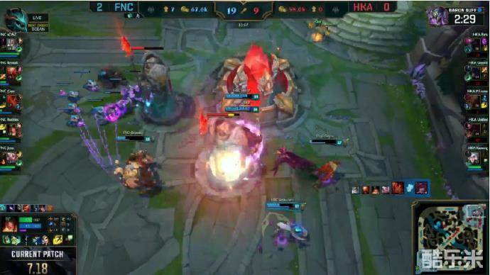 比赛来到第二局,FNC延续第一局的BP思路,HKA是一套前期进攻强势的阵容。在比赛前期,HKA的下路对线再度取得优势,但在中上野的对抗中,FNC取得巨大领先,将优势也带到了下路,因此是FNC有着全线领先。