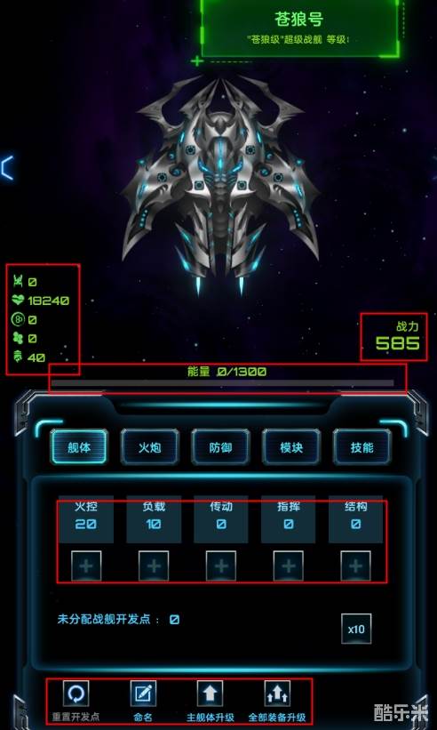 这里从上到下依次为战舰的“数值面板”,“ 战舰战力”,“ 战舰的能量”以及“战舰的加点属性”与“战舰升级”。