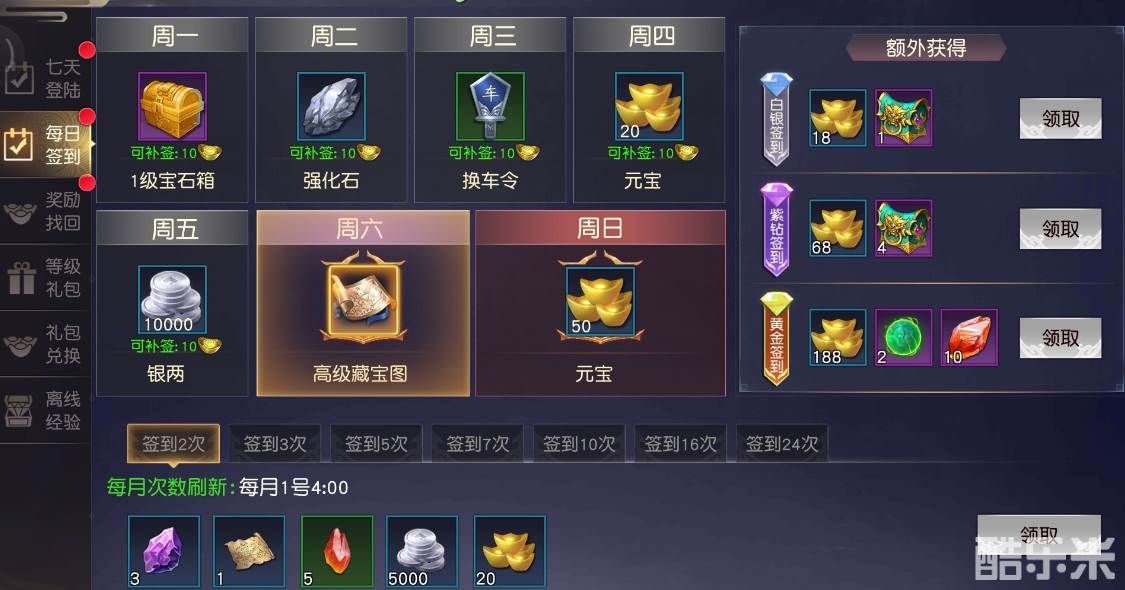 每周四周日登陆可领取20元宝和50元宝,每月累计签到一定天数也可领取少量元宝。