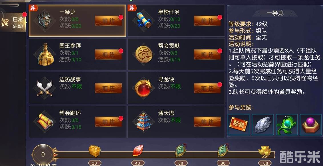 每天完成任务达到100活跃值,可以领取100元宝,积少成多。