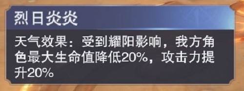 烈日炎炎:攻击力提升20%,最大生命值降低20%。
