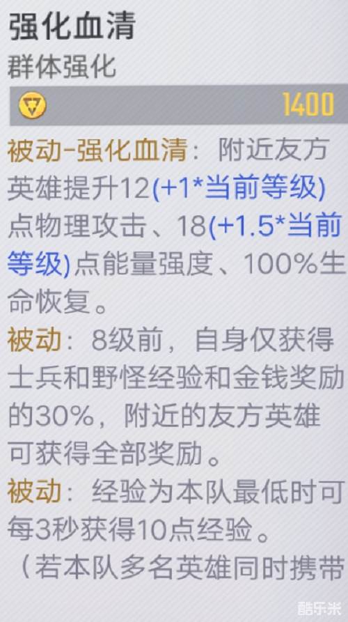 1、第一件就是强化血清,这件装备拥有着800生命值加成以及25%能量回复和10%加速冷却,8分钟前享有额外30%经济队友吃到全部经济,自己经济最后还可以享受每秒增加10经验,这件装8分钟之后的中后期作用不太大但是这件性价比较高的装备的能量回复和加速冷却对前期的魔仙子作用十分大。