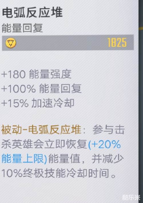 电弧反应堆参与击杀英雄立即获得20%能量上限的能量值并减少终极大招10秒冷却,在中后期爆发团战回泉水补状态会导致团战少一个人打不赢的现象发生而这件装备可以提供能量回复以及减少四技能cd来频繁对敌人阵型打乱获得团战胜利。