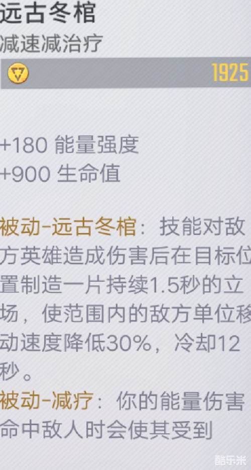 增加180能量强度和900生命值。有着魔仙子的核心――减速,减速效果有着和英雄特质被动一样的群体减速效果,冷却只有12秒,但这一件装备自重要的就是被动――减疗,这件装备简直不敢相信任何能量伤害都可以造成50%减治疗一般的物理型英雄都需要购买雷神之锤来近身承受大量伤害来换取减治疗,能量型英雄攻击范围广可以既保证自己的存活还能大幅度降低对方的治疗,尤其克制曼蒂斯、海拉、刽子手这些英雄。