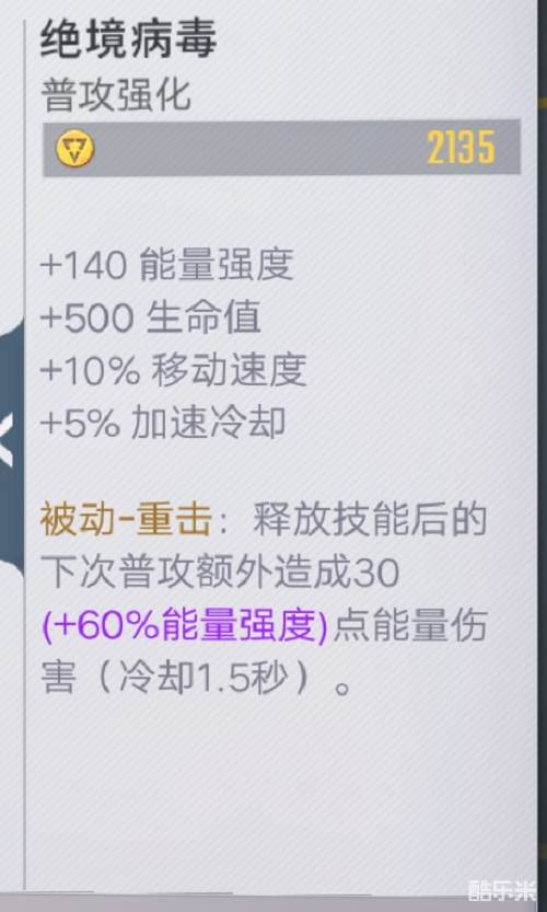 绝境病毒140能量强度和500生命值,10%的移速以及5%的加速冷却这个效果和魔仙子配合效果很好,魔仙子大多数依靠强化普攻伤害减速,这件装备的被动重击使得魔仙子的强化普攻伤害再次得到提升30+60%能量强度点能量伤害,可以把魔仙子强化普攻拉上了另一个层次,还可以把魔仙子的支援能力以及技能的加速冷却减少cd都能得到大幅度能力提升。