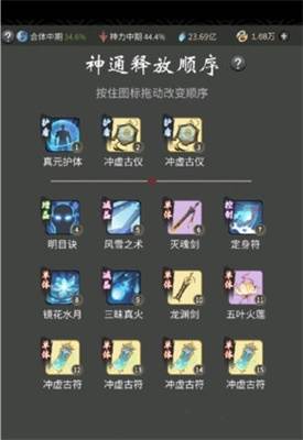 这个阶段神通基本成型,先说人界我认为最好的护盾搭配顺序【真元护体-仪-仪】在人界承伤压力没那么大不用考虑被提前破盾的时候,这就是一套全程不断盾的完美护盾排序(说一下为什么不选择踏风,踏风+两个仪是百分百会断盾的,CD转不过来,要么多带个真元盾占格子要么带珠子,珠子CD短但是护盾值太薄,综合考量下来还是选择真元+两个仪最为稳妥省心)