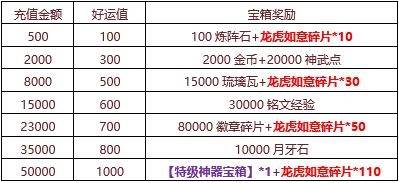 【活动内容】活动期间可通过充值金币获得好运值,积累好运值即可打开宝箱奖励,闪耀称号,全新神器,绝对超值的提升战力资源,尽在特惠好礼。