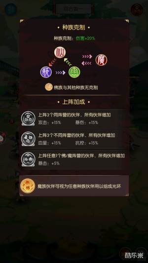在前期过游戏的新手引导时,游戏会弹出来一个上阵加成的说明,被我称之为“313组合”的阵容秘诀:即上阵3个同阵营伙伴、任意1个佛魔伙伴、3个不同阵营伙伴,所有伙伴可以获得一定程度的加成。在前期佛魔伙伴难以获得的情况下,这套组合拳对玩家推图帮助十分之大。