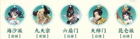1、解析:在前排九天宗和海沙派的保护下,天师门开大提供内力保证六扇门放出两个大,搭配昆仑可直接粉碎敌人。