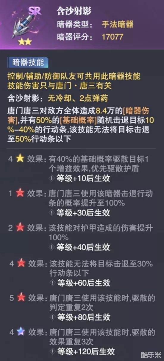 无疑这些特点都是针对于PVP作战的,所以毫无疑问这个新暗器也是官方为了弥补暗三在PVP作战中不足而新出的一个暗器,此外在无限推条队伍中【含沙射影】的击退行动条效果可能也会有所表现,具体还需要后续测试。