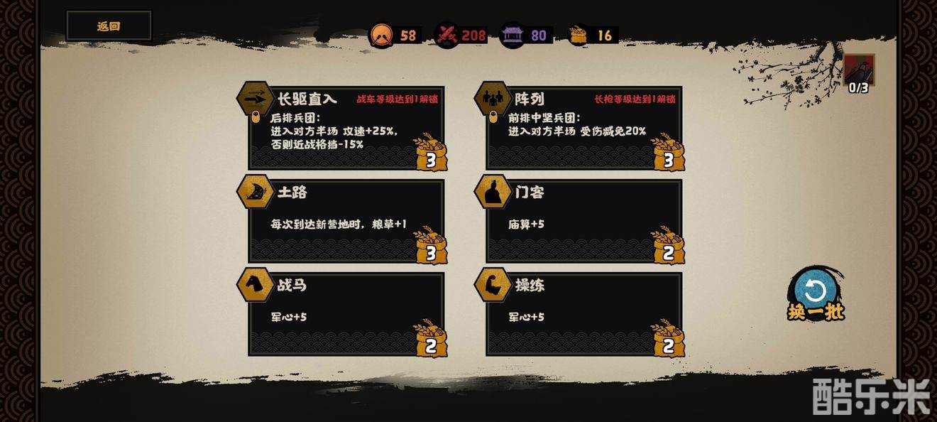 前两个营地不用拿兵,随便死不用管,刷新+1粮草的时候看到 每到营地+2000兵 也拿了,这个应该是有三档,+2000 +3000