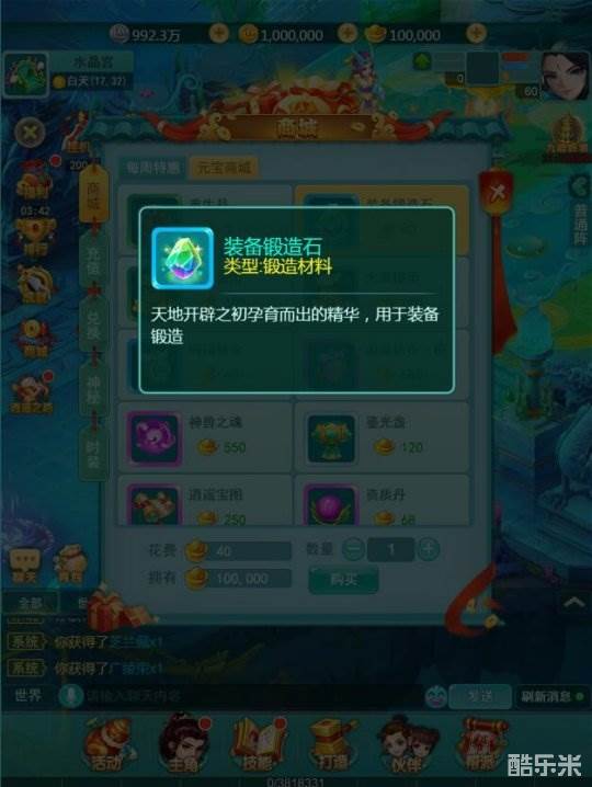 在选定了想要打造的装备后,我们先要搞到打造装备必备的原材料,也就是装备锻造石。这种石头可以直接在元宝商城里购买到,也可以在签到奖励、等级礼包里获得,所以正常玩到足够高的等级时,背包里应该已经有了足够的锻造石,让我们开始锻造吧。