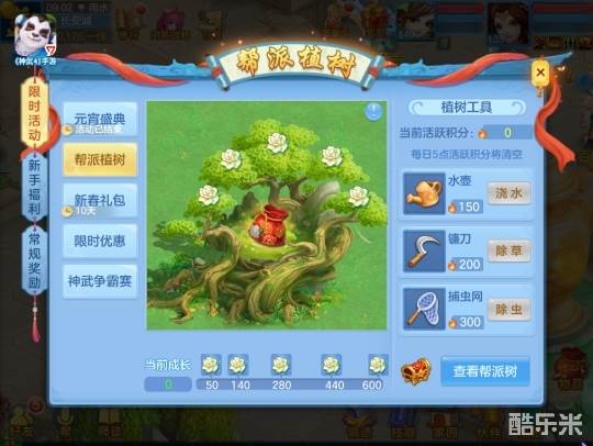 玩家通过日常累积活跃,也可获得活跃积分对小树苗进行培养,培养行为分成浇水、除草、除虫。