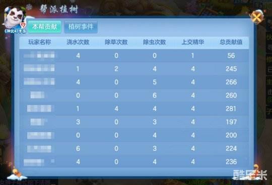 除了别有心意的“植树”过程,玩家们还能在帮派植树中看到同帮派小伙伴们的植树进度和总贡献值,彼此交流互动。