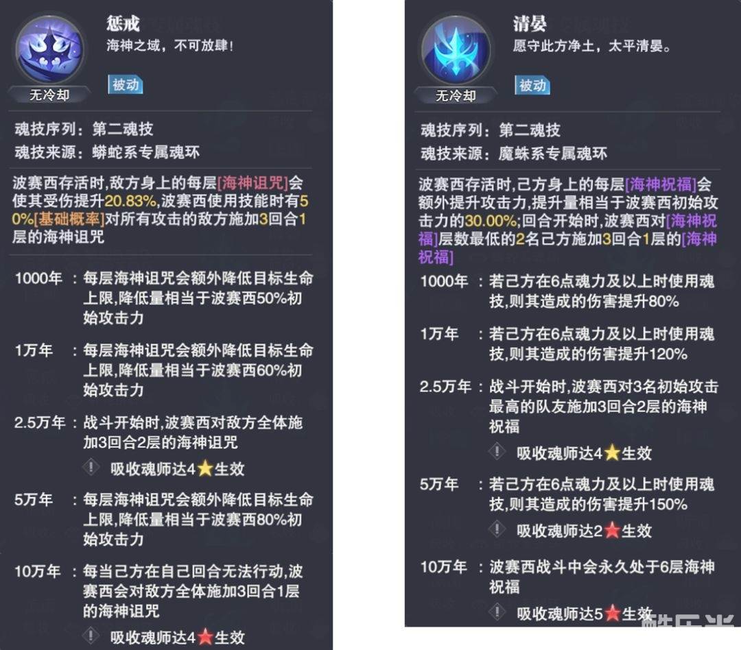 【清晏】:此技能是波赛西在【海神祝福】一脉上的核心被动,首先【海神祝福】可以提升我方魂师的攻击力,基数是按照波赛西的攻击比例来增加,所以如果大家的控制系魂师练度非常不俗的话,可能在【海神祝福】一脉的增伤也会有更好的效果,另外此技能还可以让队友在6点魂力以上时享受到造成伤害提升的效果,但唐晨由于每回合自动消耗魂力的特点,这个辅助针对他来说就太难做到了,其他的主c倒是还好