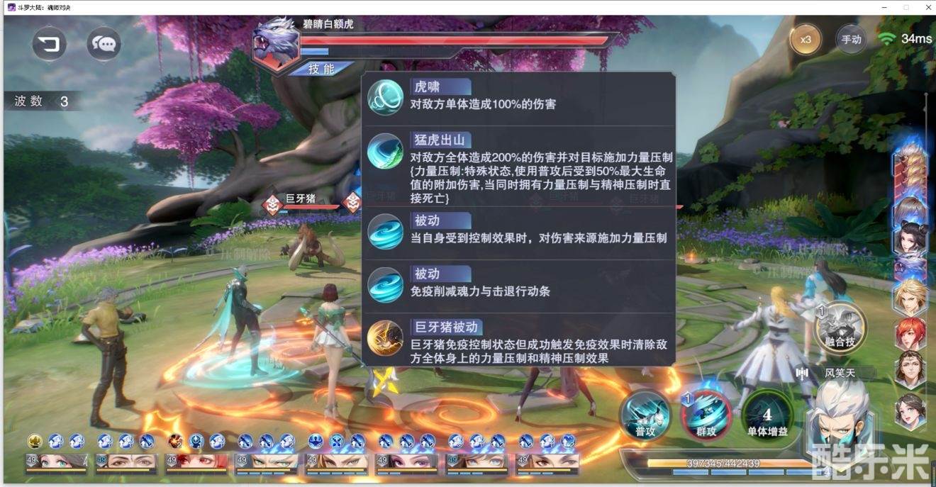 ★魂兽技能:BOSS碧睛白额虎,需要注意两个技能。猛虎出山和巨牙猪,被猪拱了必会精神压制,这点需要注意。