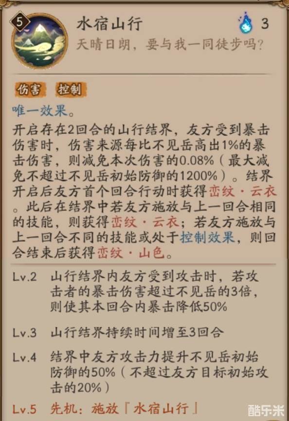 开启存在2回合的山行结界,友方受到暴击伤害时,伤害来源每比不见岳高出1%的暴击伤害,则减免本次伤害的0.08% (最大减免不超过不见岳初始防御的1200%)。结界开启后友方首个回合行动时获得峦纹·云衣。此后在结界中若友方施放与上一回合相同的技能,则获得峦纹·云衣;若友方施放与上一回合不同的技能或处于控制效果,则回合结束后获得峦纹·山色。