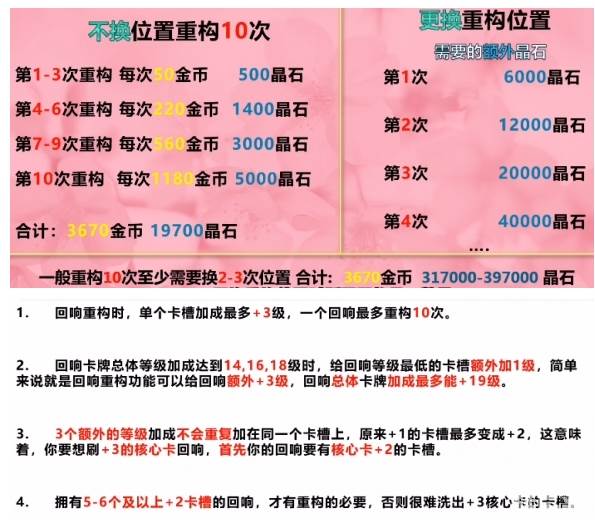 当你选定好之后,接下来将它刷到满级(16级),看一看有无6个+2级加成的卡槽,如果没有,那可以将单个+1级的卡槽进行转换(比较费金币和晶石),刷到有6个+2级为止;但如果你有两三个以上的优质回响,可以选择整体回响全部转换,直到转换出6个+2级为止。(比较费运气)