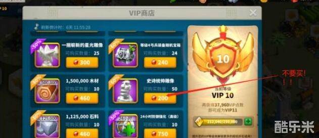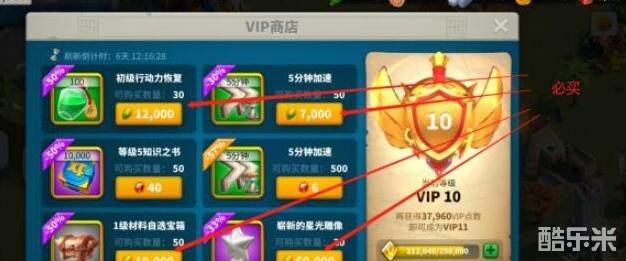 在VIP商店中,药水、粮食换的五分钟加速和材料箱推荐玩家们购买,另外紫色的星星最好也买一下,如果你资源比较多40万的金色木头也可以买,如果你资源不多就先不动。