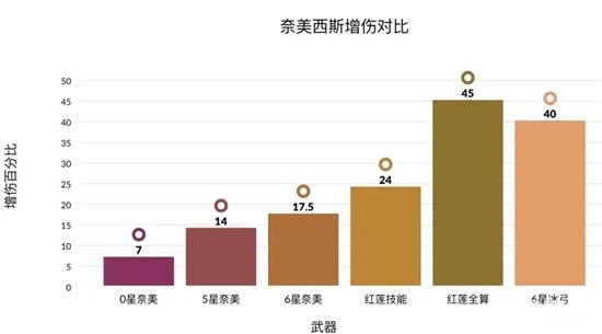 那奈美西斯对于实际的伤害提升到底高不高呢?这里up实际测试下来可得:20%雷攻增伤大概提升了7%的最终伤害。再测试了红莲与冰弓的增伤可以得到下图: