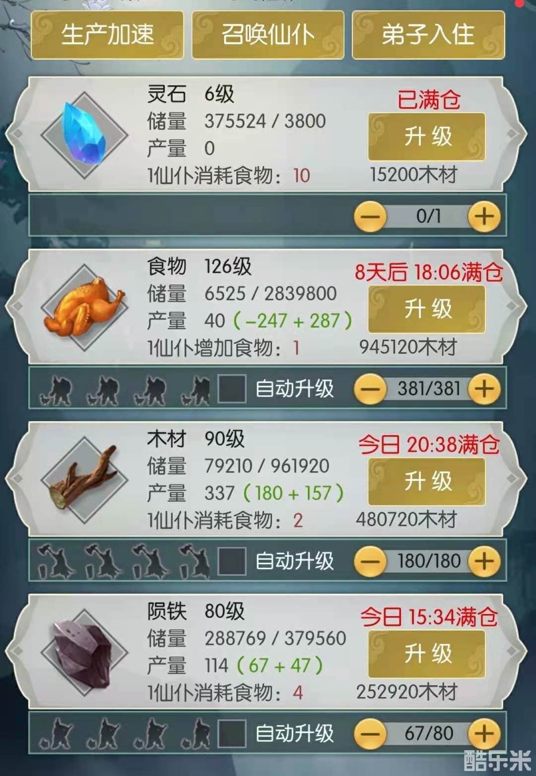 此外,木材和陨铁的产出受制于食物生产的最大仙仆数,所以升级优先级:食物>木材>>陨铁