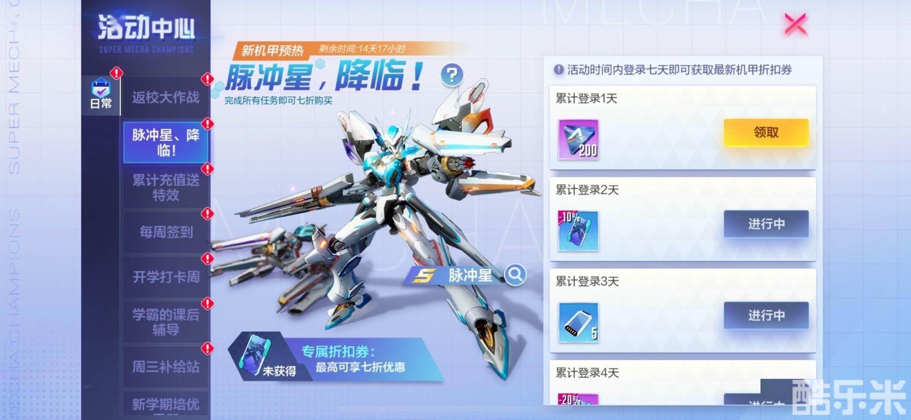 预热活动上线,累计登录领取好礼,最高可获得脉冲星七折购买折扣券!动动指尖参与活动,变革的脉冲,入你囊中!