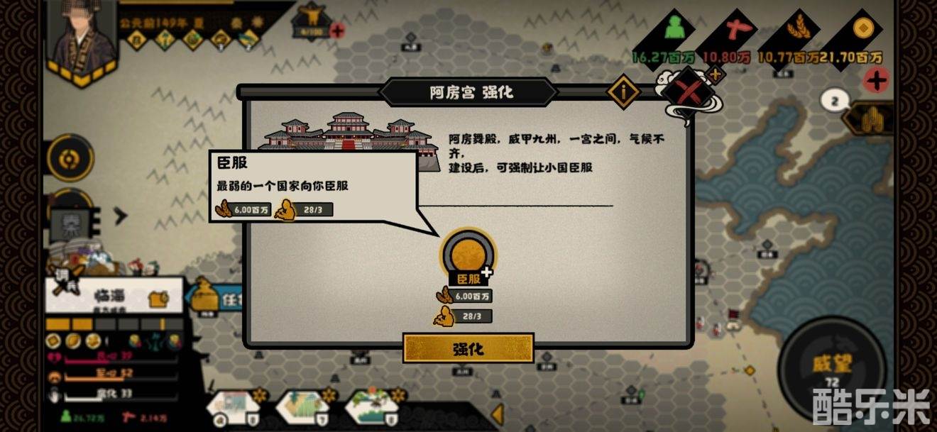 这个时候就到了阿房宫登场,游戏进入尾声,等阿房宫的时候可以收收菜,做做事件,巡访