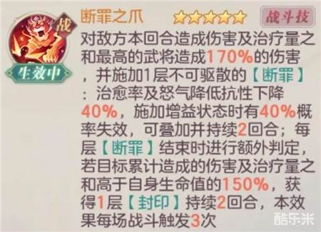 (2)由于封印很难发挥作用,那么狴犴出战主要发挥作用的便是【断罪】提供的怒抗降低和增益失效。怒抗降低效果曾经是一个优秀的属性,但是在现在的版本,怒气相关属性已然泛滥,就连山河遗迹山河同行赛季的风物志羁绊,都可以提供海量常驻抗性,如此数值,还是延迟获取的怒抗降低实在太过平庸;而施加增益失效buff在上面已经作了分析,本身是不错的属性,但是想达到逆天改命,扭转战局的作用,还是太强人所难了。