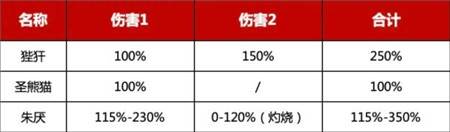 火烧拥有了非常强力的输出增幅灵宠火麒麟,而直伤队伍在补足伤害方面一直没有获得很好的灵宠,以至于紫色圣熊猫至今还是高频使用的伤害灵宠,作为拥有一次性爆发的灵宠,其在伤害上可以与同为伤害型灵宠的熊猫朱厌作比较(默认灵宠增伤与对方灵宠减伤抵消)。