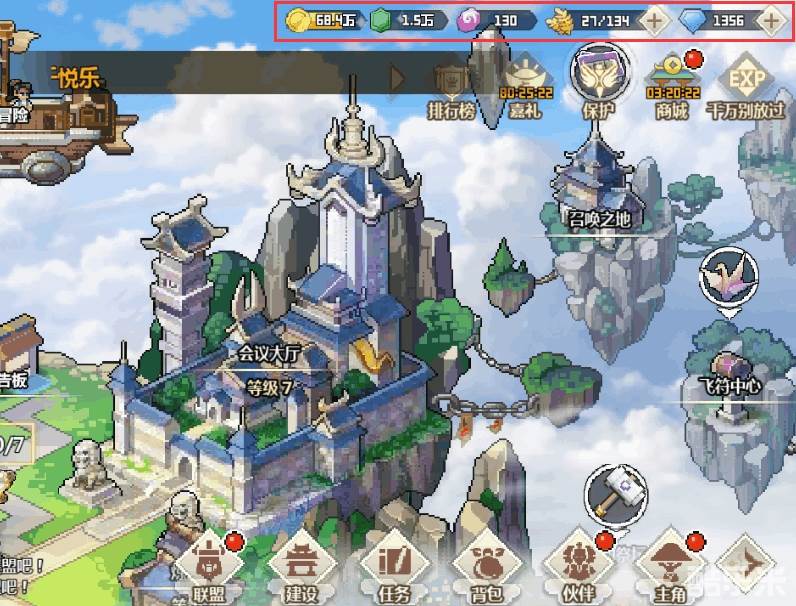 A:右上角红框资源从左到右分别为 灵币(灵币井、冶炼厂与游戏探险&pvp玩法产出)、灵石(灵石灵脉、灵石矿洞与游戏探险&pvp玩法产出)、仙石(游戏活动、仙石福利产出)、灵谷(灵植田、灵牧场和游戏活动产出,也可用神石购买但是有次数限制)、神石(付费货币、游戏活动产出)