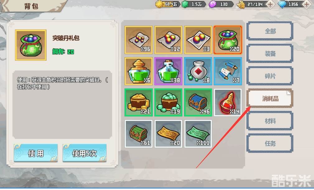 A:请在主界面下方点击“背包”按钮,进入后在右侧点击“消耗品”筛选钮,即可找到您可以使用的物品了。