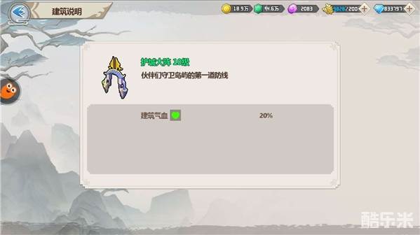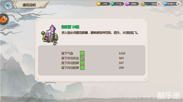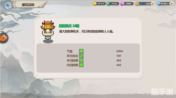 这两个就放在一起说吧,防御机关的作用主要是在守城战(PVP)和入侵战(PVE)两种玩法中提供额外的防护火力,满级的防御机关提供的攻击力还是很不错的,但是相对来说性价比不如小兵高(被打爆了就没了,且身后就是大阵没有延展性);而护城大阵是提供给所有防御性建筑物额外的血量,这个数值由护城大阵等级决定上限,这两个建筑物都属防御性建筑,在阁下资源充裕时可考虑发展起来。