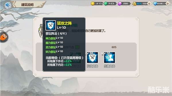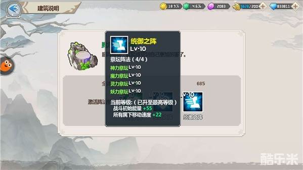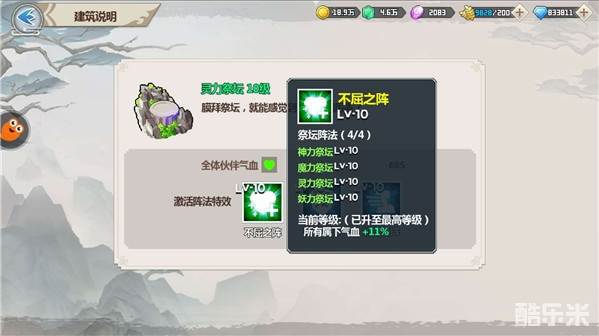 这几个祭坛阵的建造需要消耗符石,建造和升级难度颇高,但是它们提供的祭坛阵法加成也同样重要,请各位修者大人参考一下截图中的数据来考量一下是否要把它们的修筑提上日程;另外提醒一下,第一个阵法需要任意2个同等级祭坛,而想要激活所有祭坛阵法只有在同等级的4个祭坛都激活的情况下才可以,请注意。