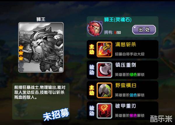 《暴走萌部落2》英雄狮王是游戏中的前排输出型副坦,拥有强力单体输出与范围伤害,进阶到紫色能够解锁四技能穿透护甲,让自己的输出能力再上一个台阶。