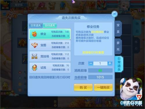 激活老角色回归资格后,少侠在完成日常领取200、400活跃度礼盒可获得前缘值,前往【聚宝盒】-【回归遗失】分页消耗前缘值可购买日常玩法储备次数,前缘值每日5:00重置,维护后登录仍处于回归状态的角色,也将可获得前缘值购买日常遗失次数。