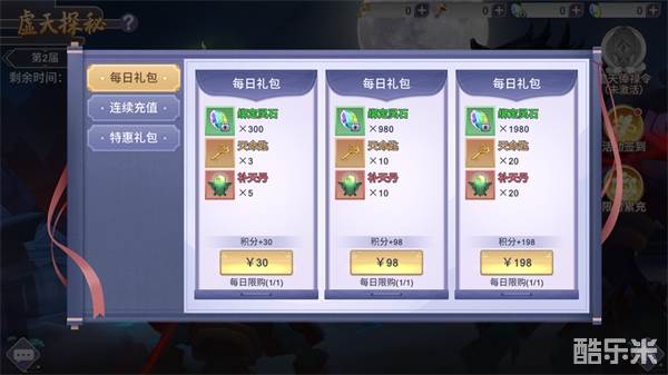 2.每日礼包有30、98、198元三个档次,可获得绑定灵石、天命匙、补天丹;