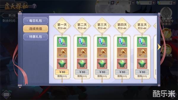 1.虚天商铺分为每日礼包、连续充值、特惠礼包三类;