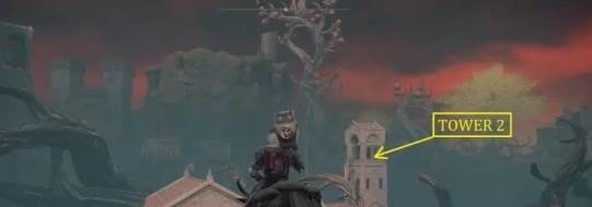 沿着屋顶一直往前就能看到第二座塔,过去之后,爬上楼梯点燃烛台。