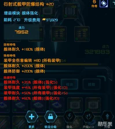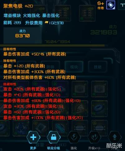 【模块装备】:简单分为攻击类的和防御类的,攻击类的一般强化火炮或技能的攻击属性,例如“聚焦电极”,“镭射穿刺”,“极化脉冲”,“狂暴增幅器”等等。防御类则是一般强化舰体的护盾,装甲,耐久。例如“可汗的恩泽”,“衍射式舰甲防爆结构”等。其中如何安装,是走极致的输出路线,还是纯肉路线,或者是半肉半输出路线,全靠舰长大人自己来决策