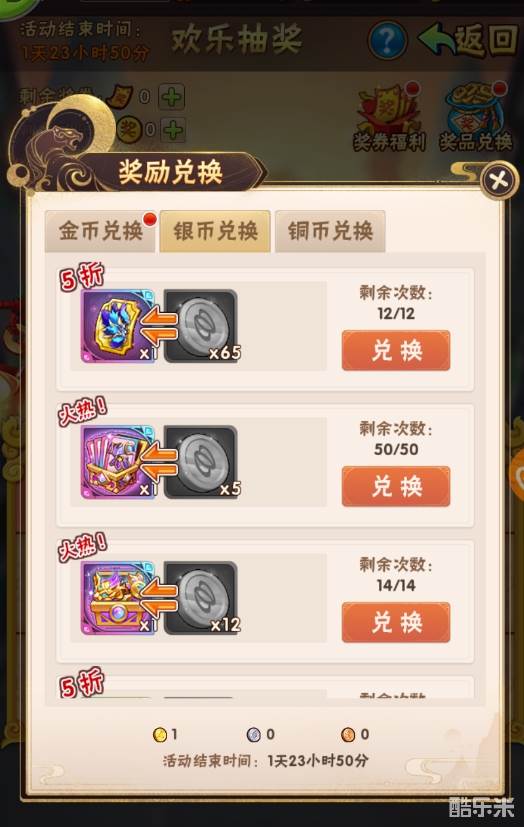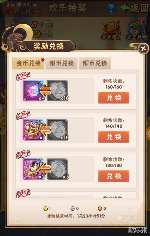 活动中的欢乐金币、欢乐银币、欢乐铜币、奖券道具在奖励兑换结束时间后会消失,请及时兑换。