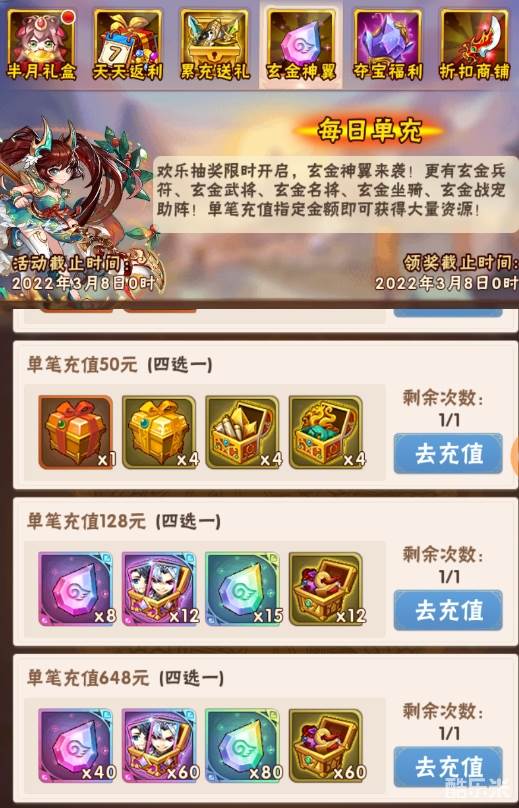 活动一、每日单充 玄金神翼