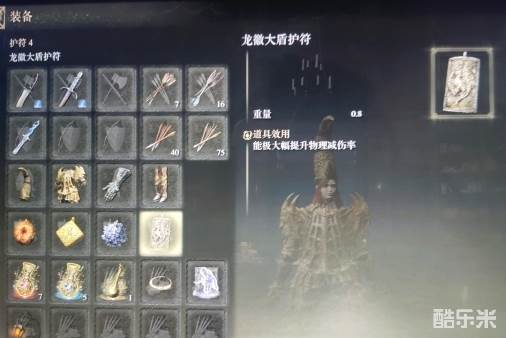 首先看一下防御装备,这代游戏绝大部分敌人都是物理伤害,龙徽大盾护符是绝对的核心装备,我这里要压级才带了拉达冈的糜烂印记,不压级的话建议把血精多点五点就行了,然后带上增加法术伤害的护符,不带拉达冈的糜烂印记的话,你的物理减伤率能到45%,非常离谱的数值,因为要知道拉塔恩一套才减伤率才百分之三十几